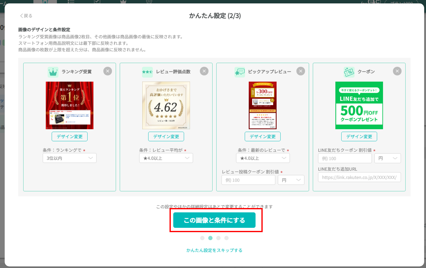 それぞれ表示されている画像デザイン、条件がおすすめの設定ですが、