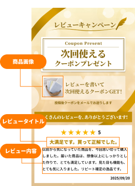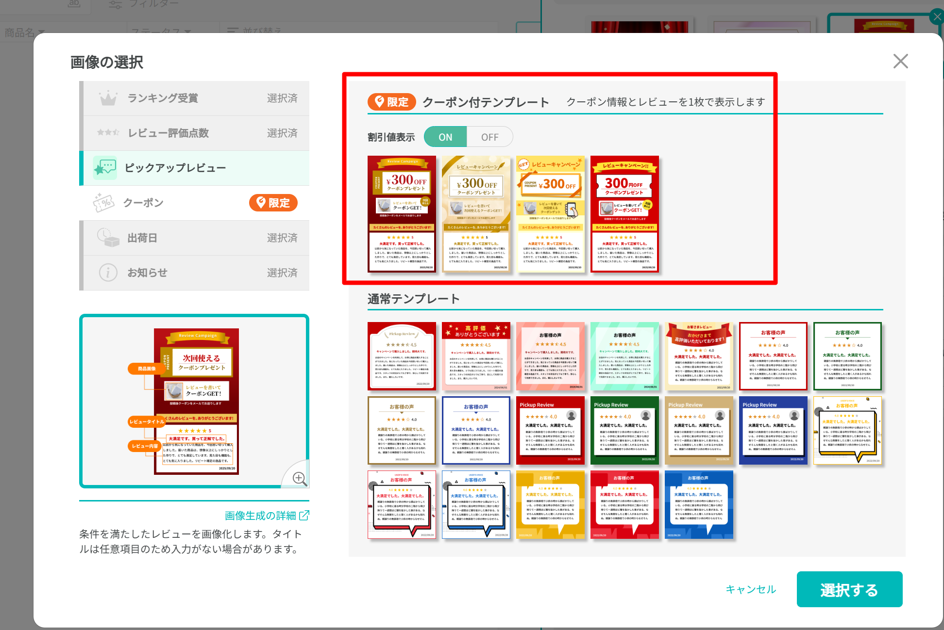 クーポン情報とレビューを1枚の画像にまとめて表示します。