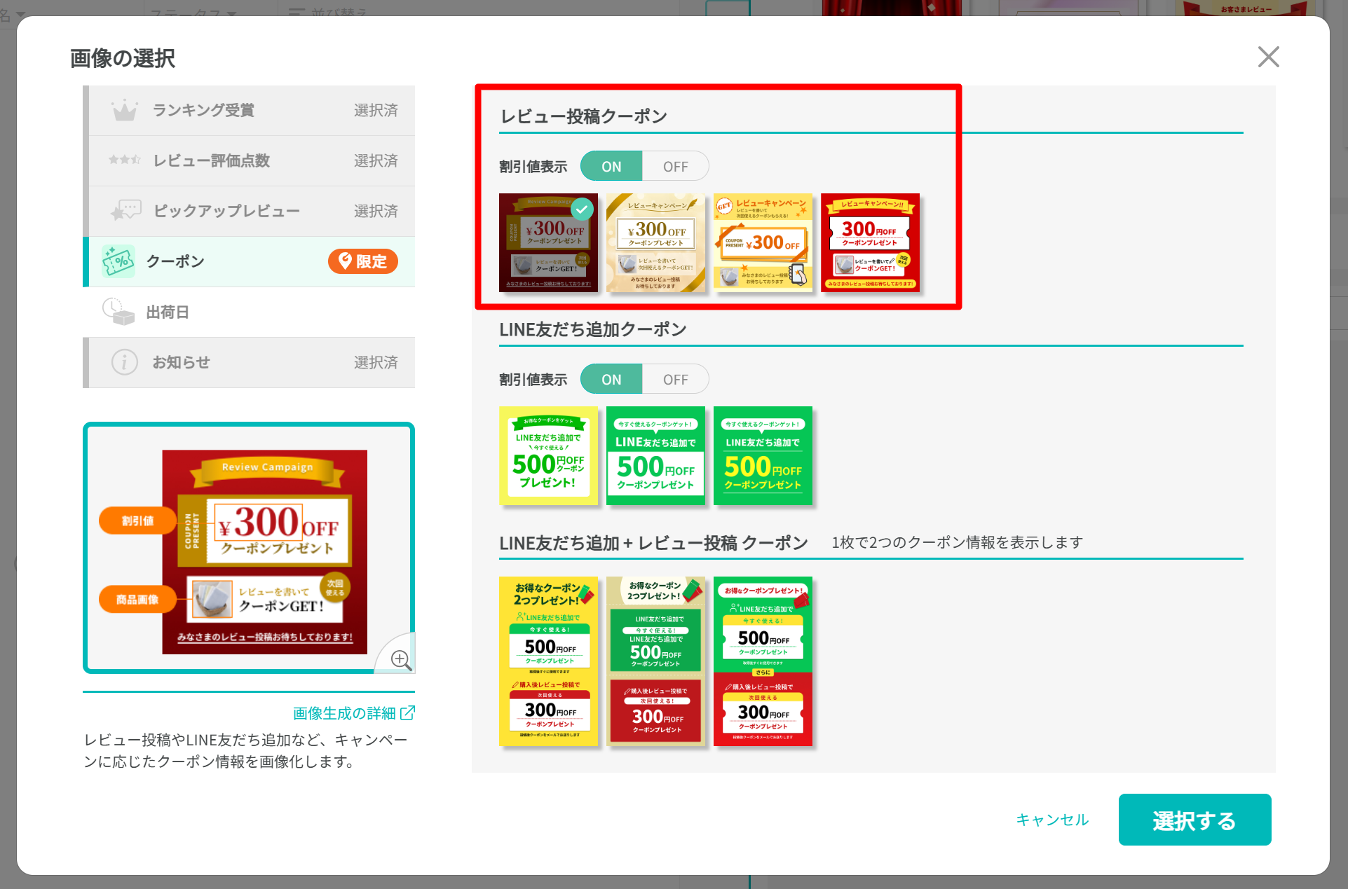 この画像を選択した場合、次のステップで 「レビュー投稿クーポン 割引値」 の入力が必要です。
