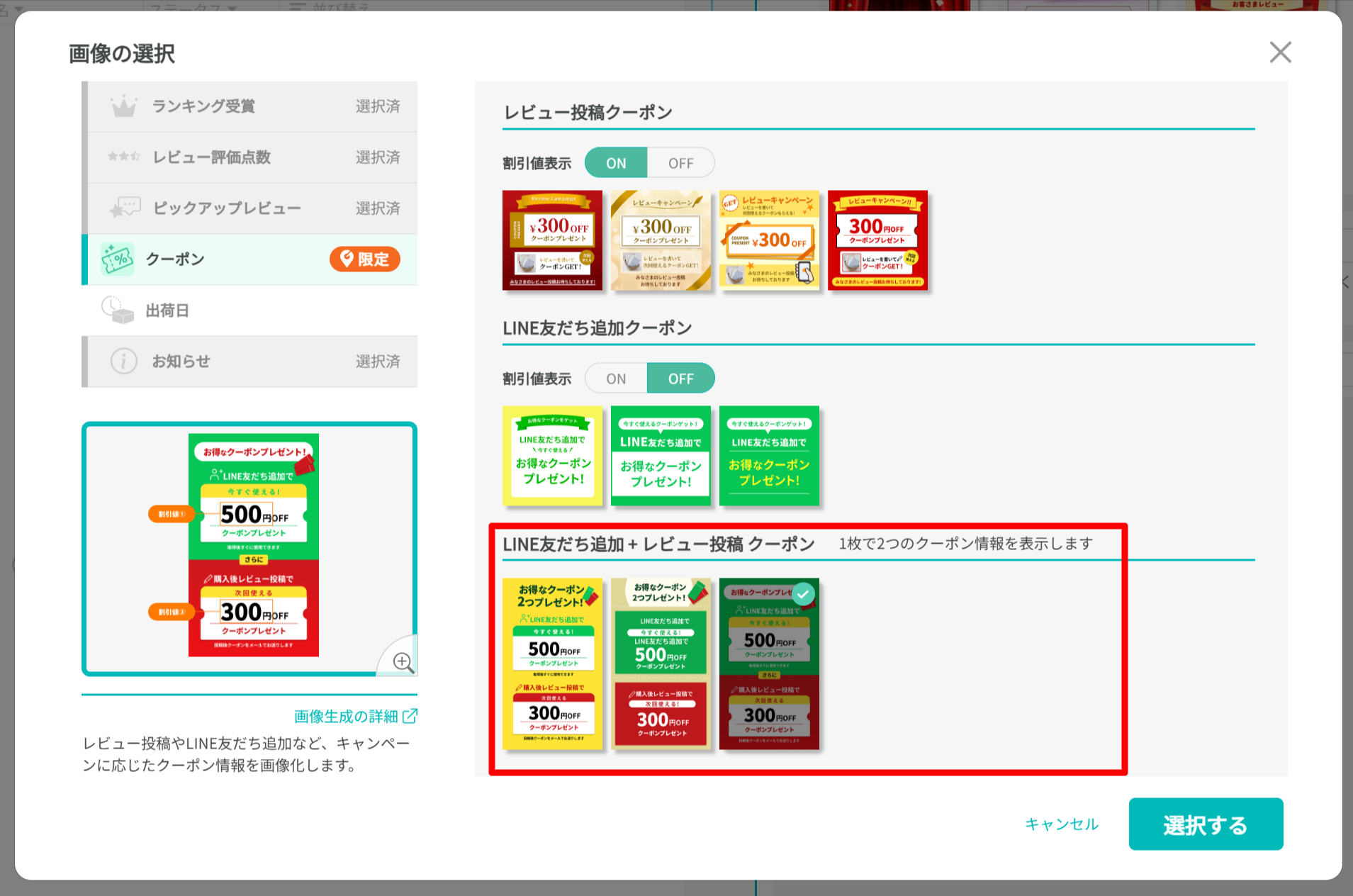 入力した金額が、画像内のレビュー投稿クーポンとして表示されます。