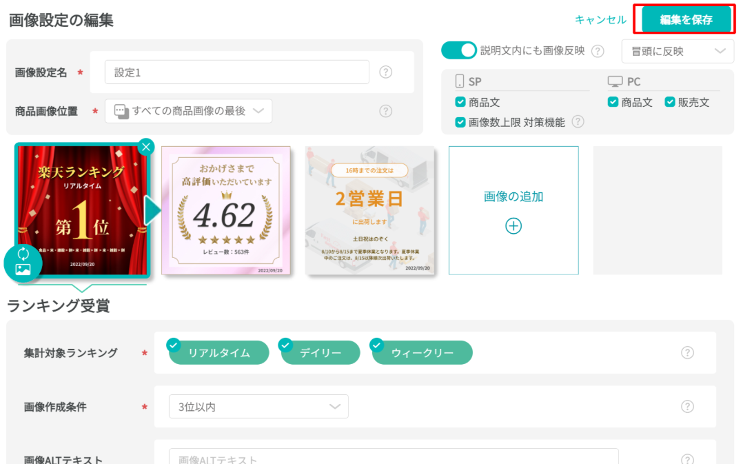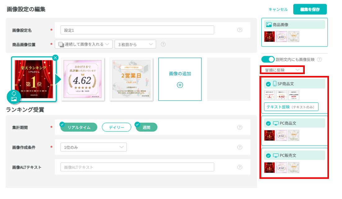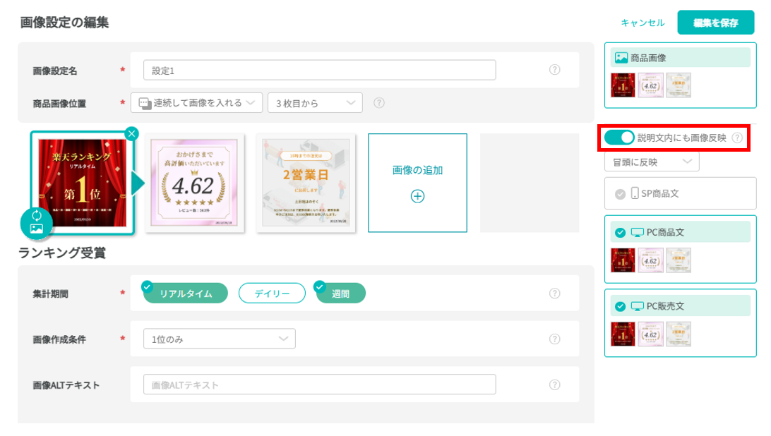 商品画像エリアに反映している画像を、以下のエリアにも反映する機能です。