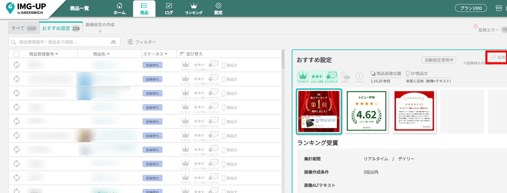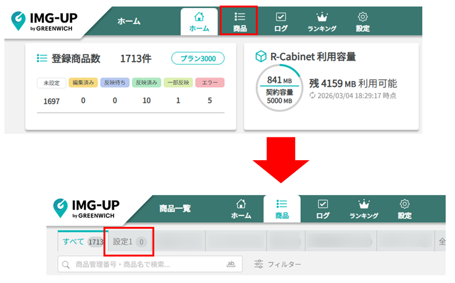 画面上部の「商品」より、商品一覧を開き、説明文に反映したい画像設定を選択します。