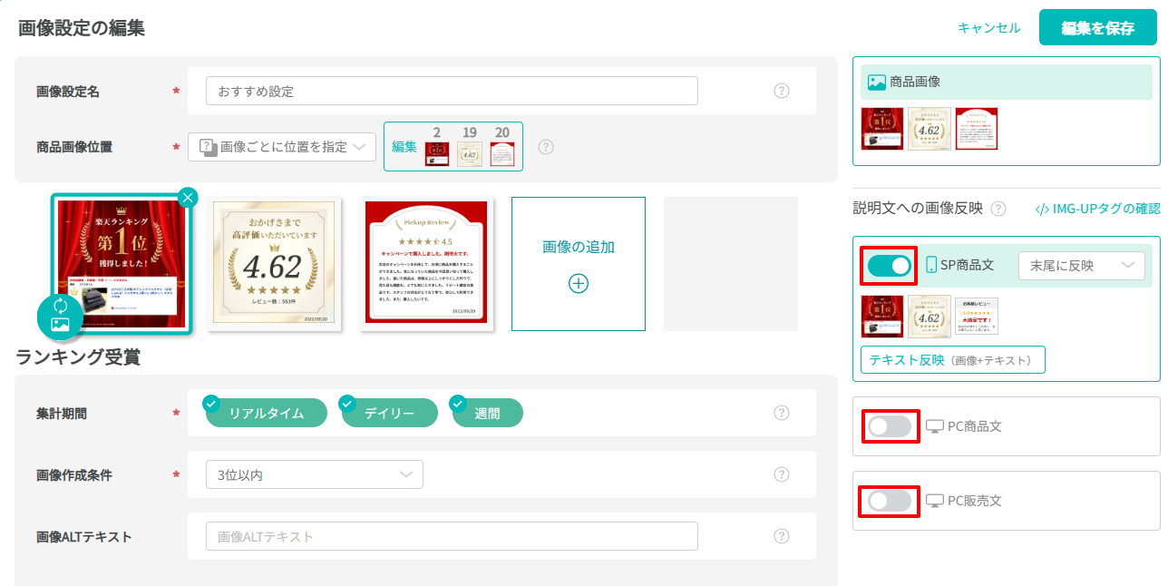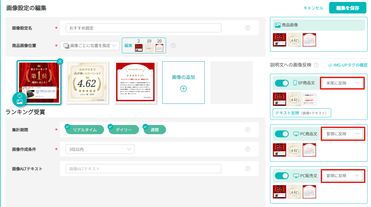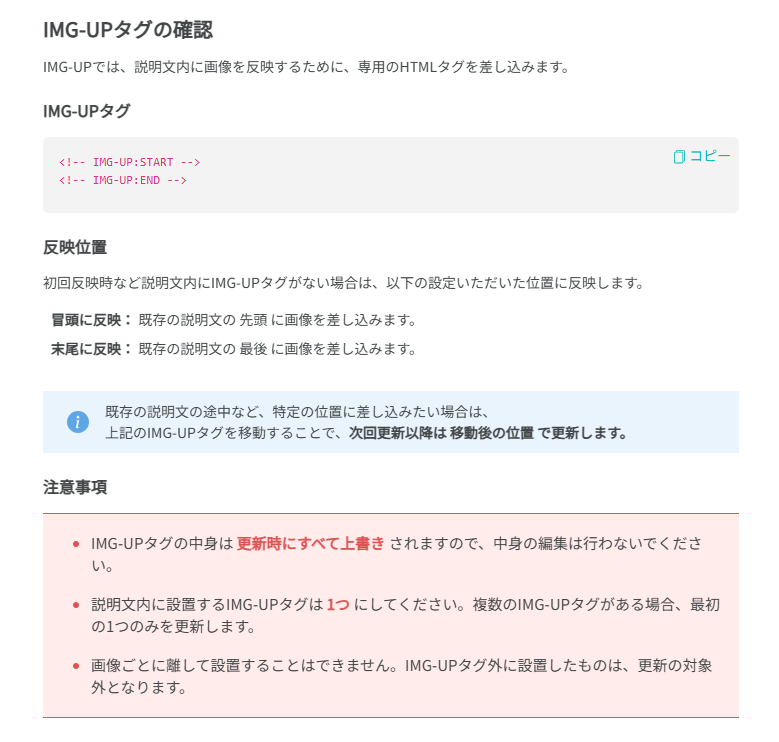 初回反映時など説明文内にIMG-UPタグがない場合は、以下の設定いただいた位置に反映します。