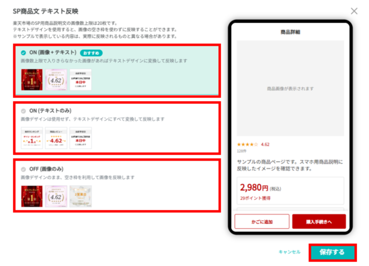 スマホ商品文では、画像表示またはテキスト表示の選択が可能です。